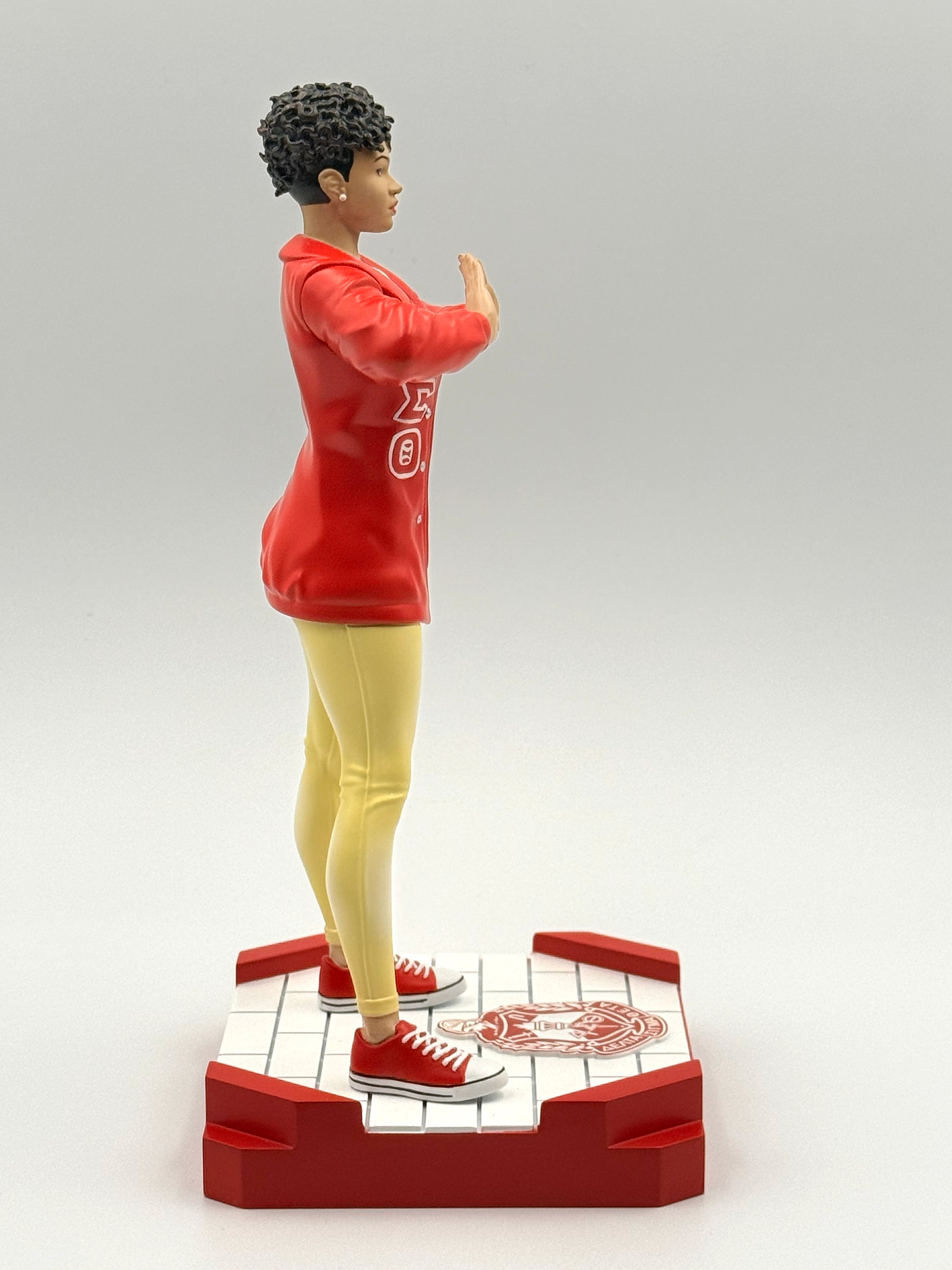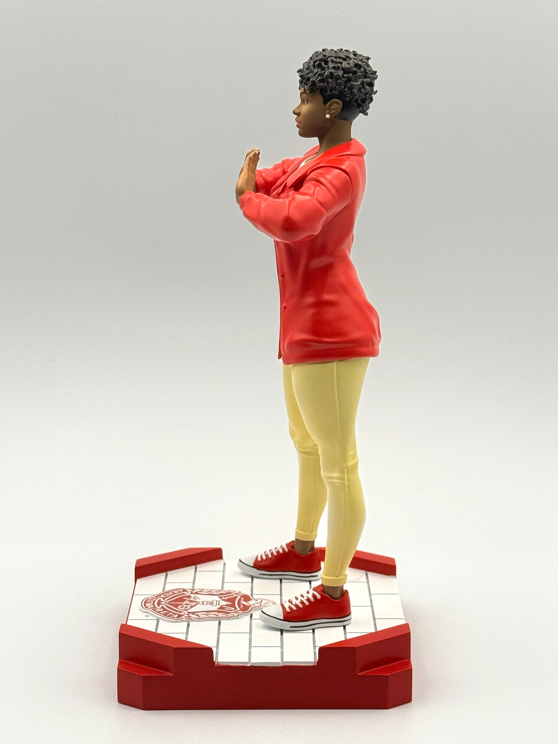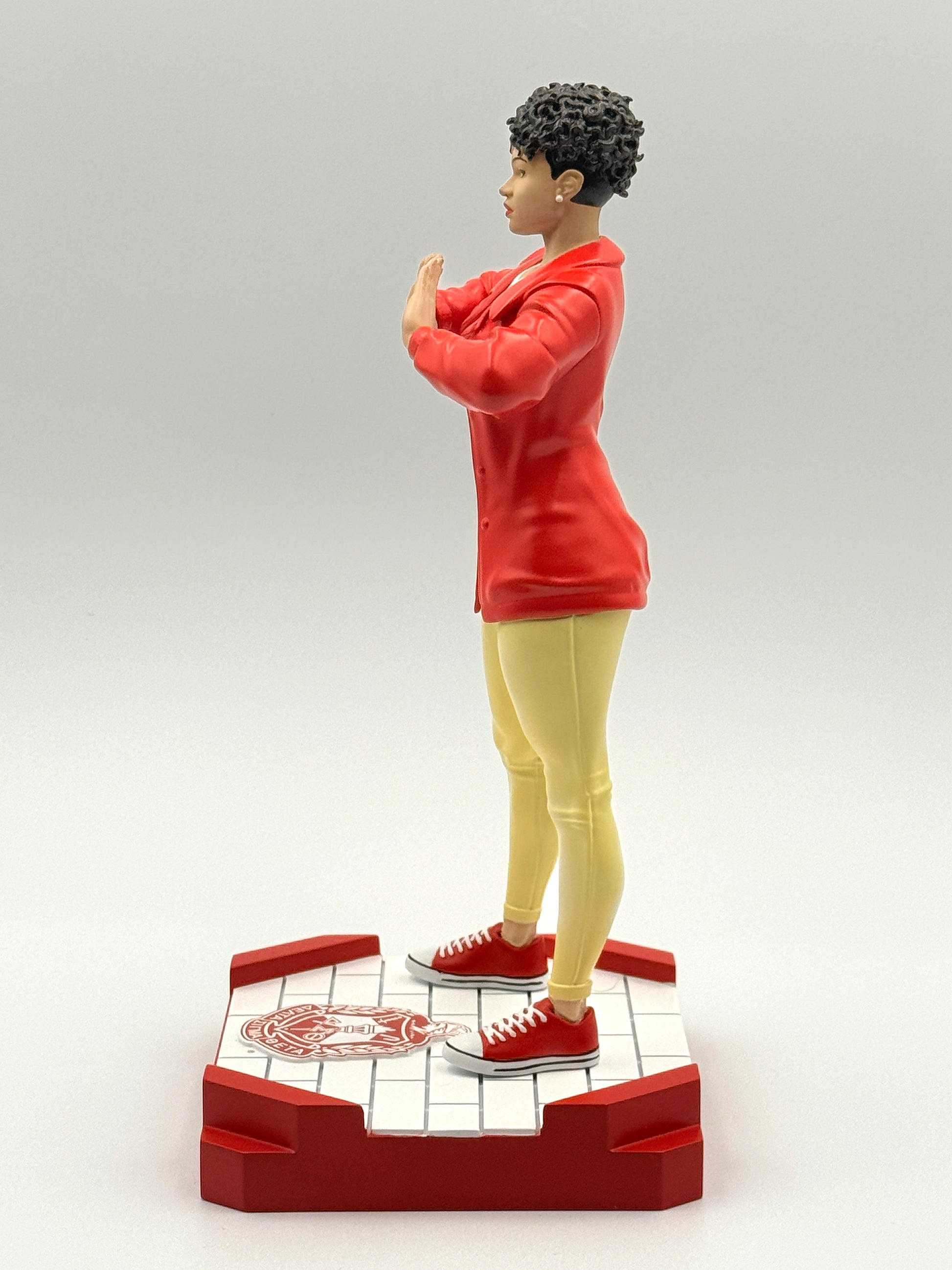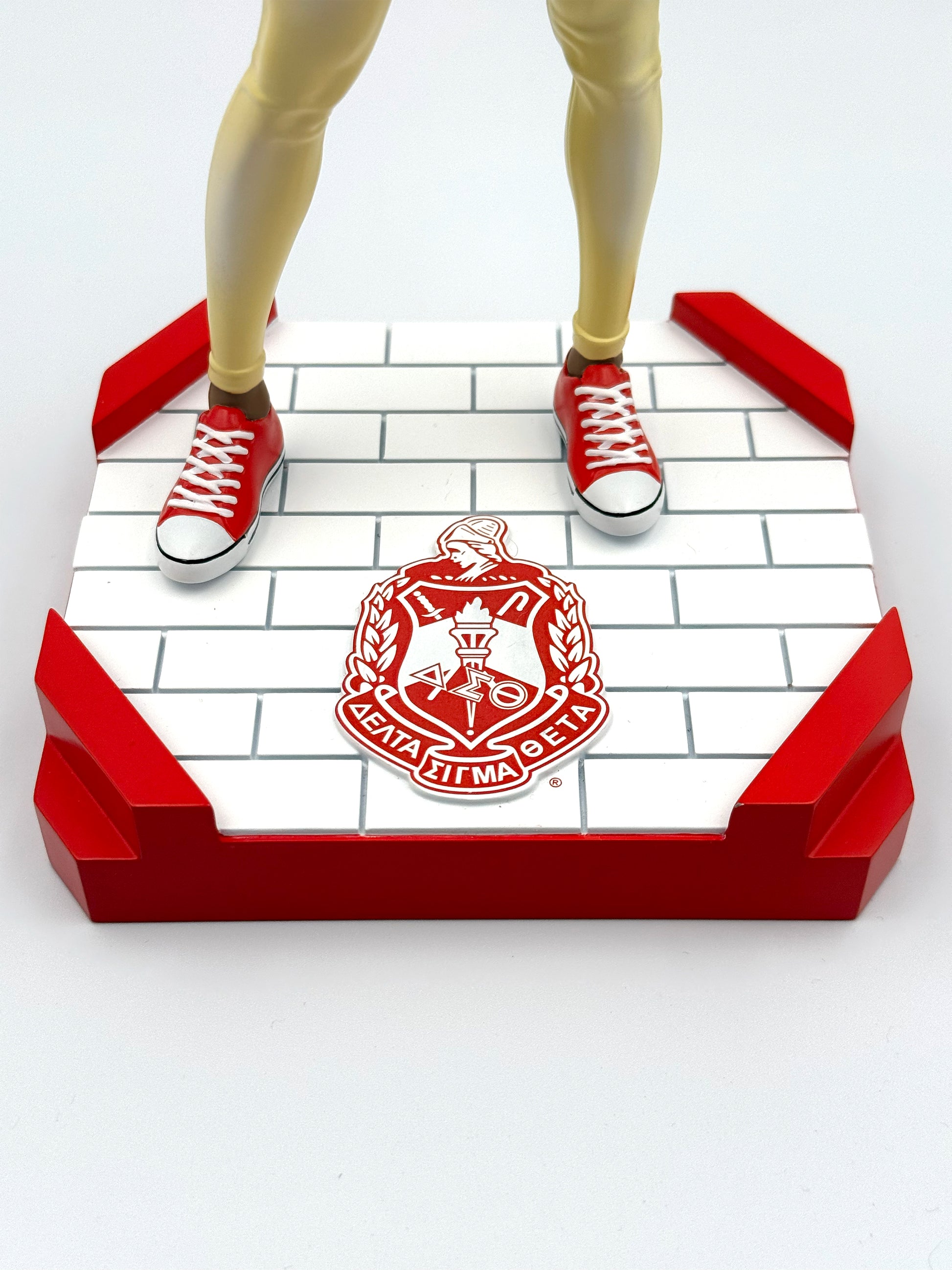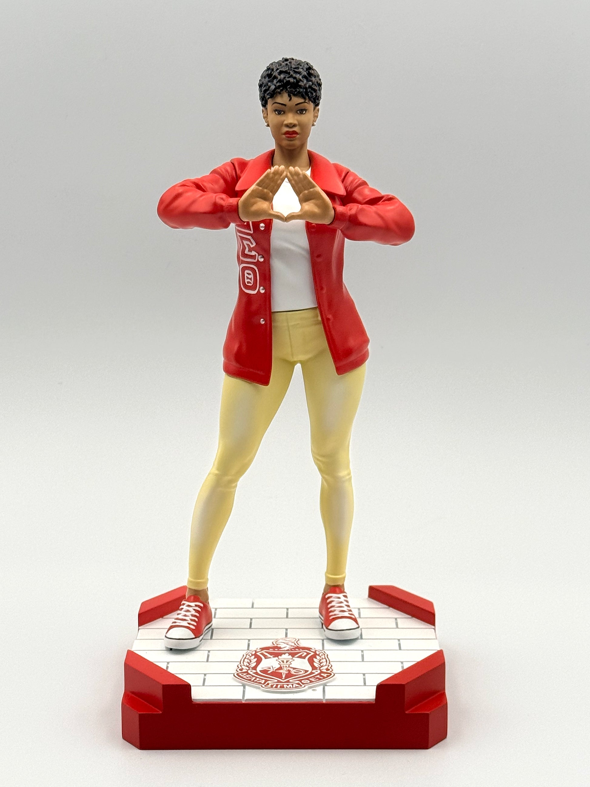 This officially licensed, scaled PVC figure represents the ultimate Delta woman. It stands 9.5 inches tall and is detailed in the colors of Delta Sigma Theta Sorority, Inc. Delta Diva comes with two interchangeable heads wearing different hairstyles. She is positioned on a detachable "plot" base measuring 4.75 inches x 4.5 inches, allowing her to be displayed in any special place. Delta Diva is available in three skin tones, Honey (light), Caramel (medium), and Mahogany (dark).